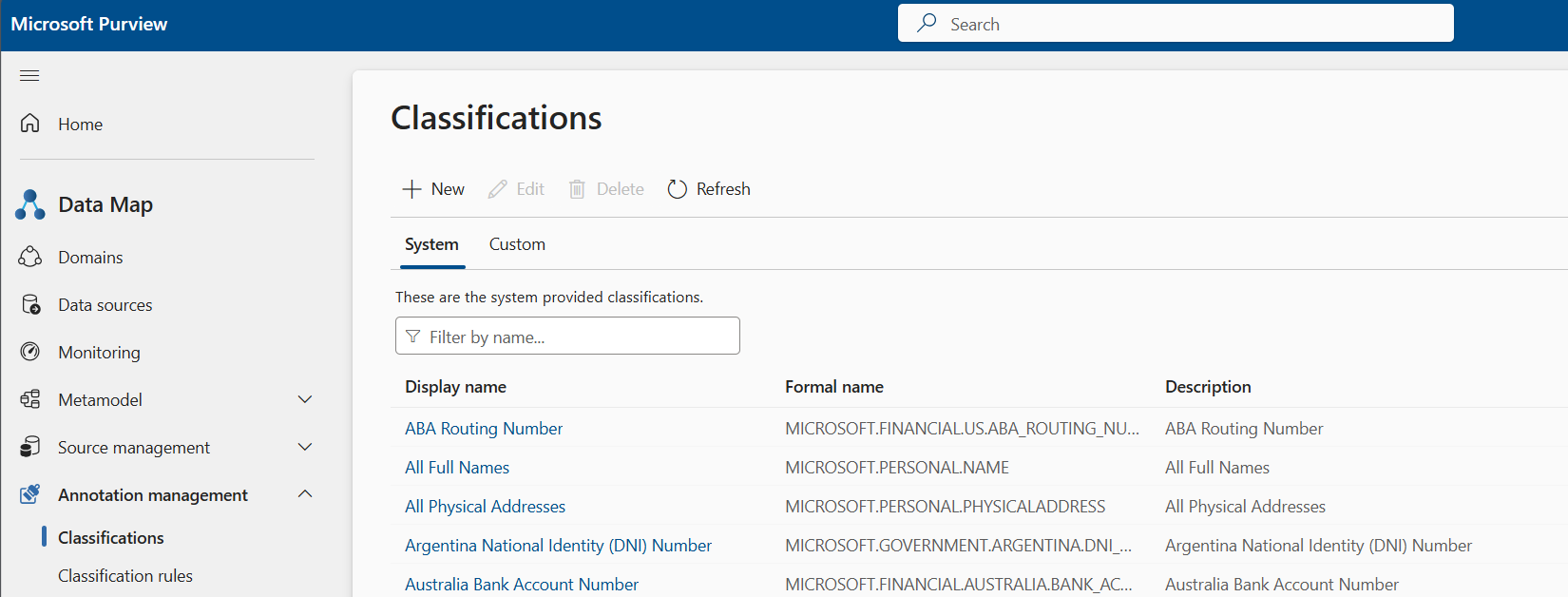 查看要应用于要扫描的数据资产的可用系统分类。 系统分类的正式名称具有 MICROSOFT 前缀。