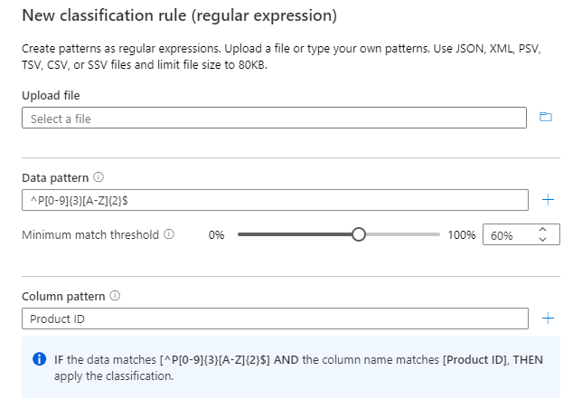 配置与数据模式匹配的数据可接受的 最小匹配阈值 参数,以应用分类。 阈值可以为 1% 到 100%。 建议将值至少设置为 60% 作为阈值,以避免误报。 但是,可以根据需要针对特定分类方案进行配置。 例如,如果要检测数据中的任何值并应用分类(如果该值与模式匹配),则阈值可能低至 1%。