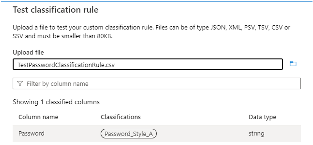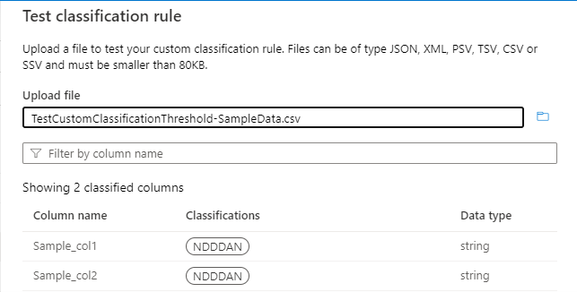使用 测试分类规则 并结合示例数据进行测试,验证分类规则是否按预期工作。 例如,确保在示例数据 (中,在 .csv 文件中) 至少存在三列,包括要对其应用分类的列。 如果测试成功,则应在列上看到分类标签,如下图所示:
