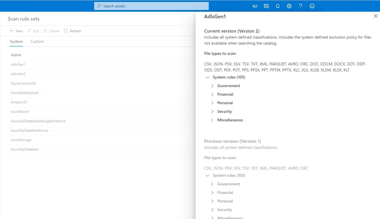 系统扫描规则集是Microsoft定义的扫描规则集,这些规则集会自动为每个 Microsoft Purview 目录创建。 每个系统扫描规则集都与特定的数据源类型相关联。 创建扫描时,可以将其与系统扫描规则集相关联。 每次Microsoft对这些系统规则集进行更新时,都可以在目录中更新它们,并将更新应用于所有关联的扫描。