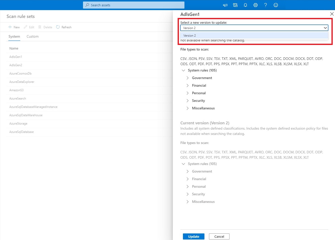 如果更新可用于系统扫描规则集,则可以在“版本”列中选择“更新”。 在系统扫描规则页中,从 “选择要更新的新版本”下拉列表中选择一个版本 。 该页提供与新版本和当前版本关联的系统分类规则列表。