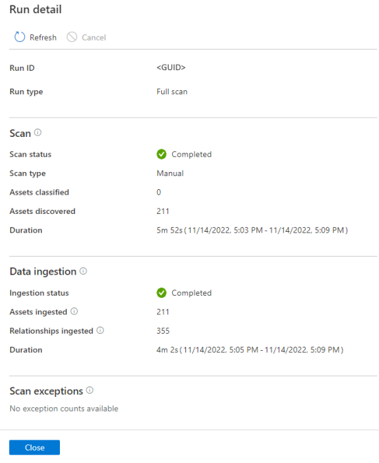 - 发现的资产:从源中枚举的资产数。 对于完整扫描和增量扫描,它包括配置范围中的所有资产,无论这些资产是现有资产,还是自上次扫描运行以来新创建或更新的资产。 对于增量扫描,Microsoft Purview 仅提取新创建或更新的资产的详细元数据。