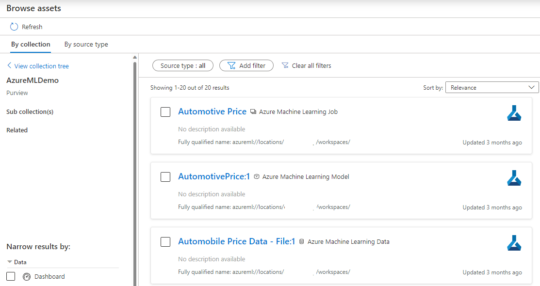 注册 Azure 机器学习工作区后,元数据将每天自动推送到 Microsoft Purview。