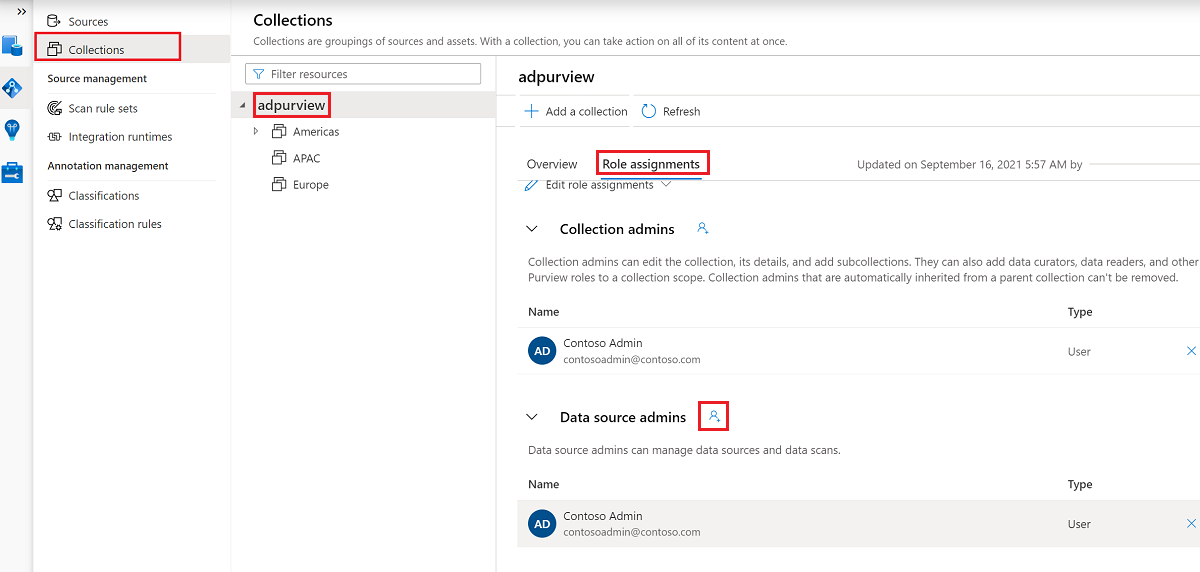 任何 Microsoft Purview 根集合管理员都可以将新用户分配到根“策略创建者”角色。 任何集合管理员都可以将新用户分配到该集合下的“数据源管理员”角色。 最大程度地减少具有 Microsoft Purview 集合管理员、数据源管理员或策略创建者角色的用户并对其仔细审查。