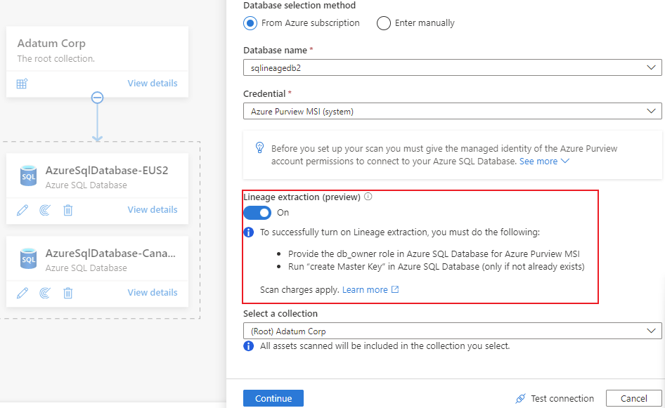 Microsoft Purview 支持 Azure SQL 数据库的视图和存储过程的世系。 虽然在扫描过程中支持视图世系,但设置扫描时,需要打开世系提取开关来提取存储过程世系。