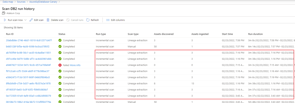 成功设置扫描后,名为“世系提取”的新扫描类型将每隔六小时运行一次增量扫描,以从 Azure SQL 数据库中提取世系。 世系是根据 SQL 数据库中的存储过程运行提取的。