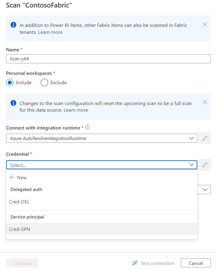 如果您切换扫描配置以包括或排除个人工作区,将触发对 Fabric 数据源的全面扫描。