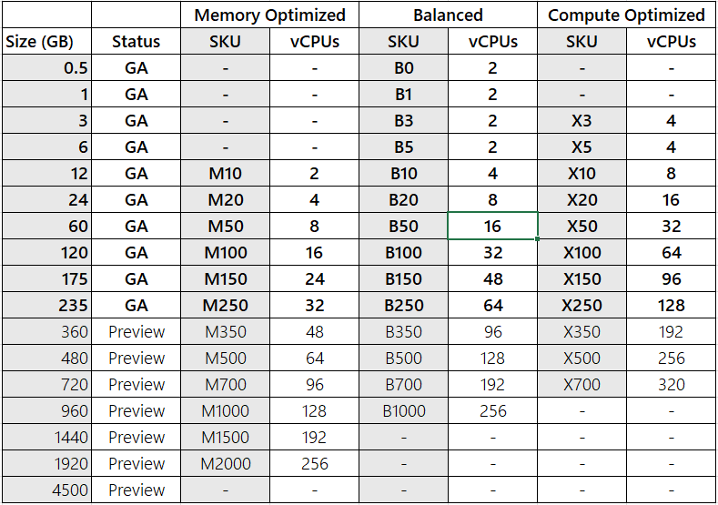 使用超过 235 GB 存储的所有内存中层都处于公共预览状态,包括内存优化 M350 及更高版本;平衡 B350 及更高版本;和计算优化 X350 及更高版本。 所有这些层及更高版本均以公共预览版提供。