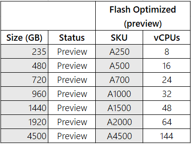 使用超过 235 GB 存储的所有内存中层都处于公共预览状态,包括内存优化 M350 及更高版本;平衡 B350 及更高版本;和计算优化 X350 及更高版本。 所有这些层及更高版本均以公共预览版提供。