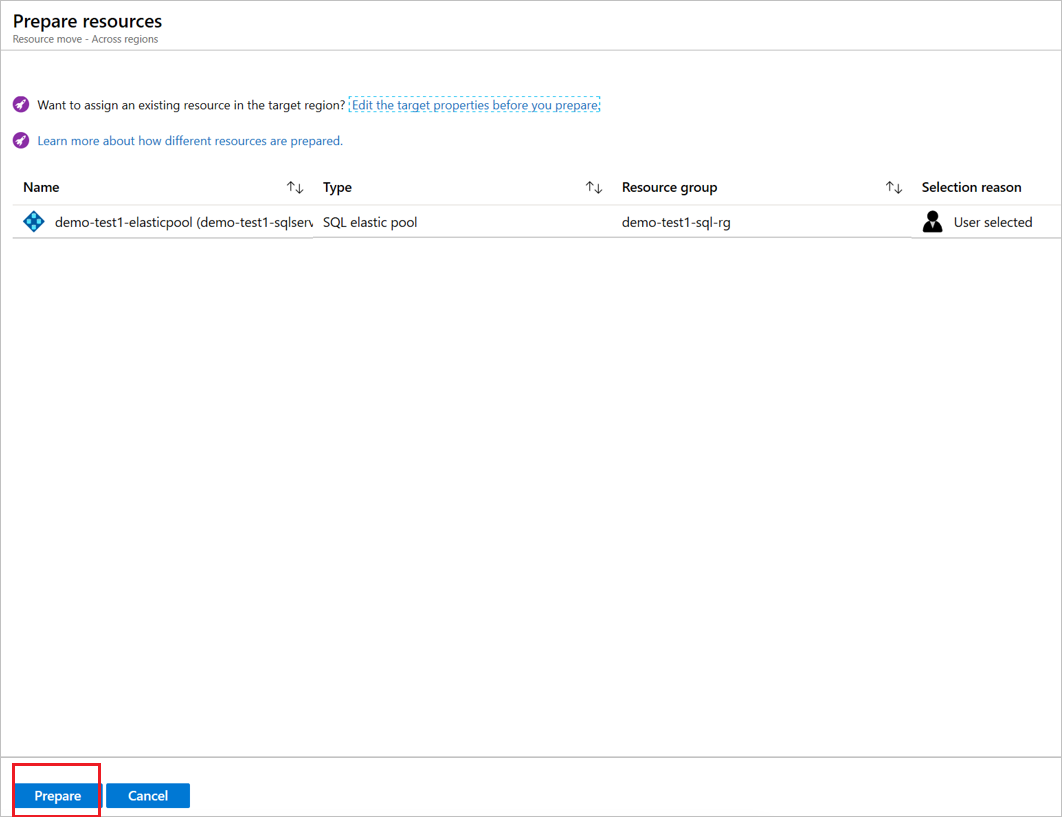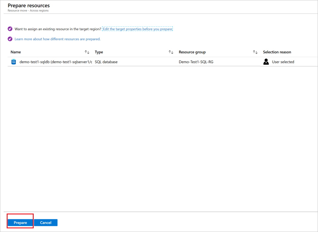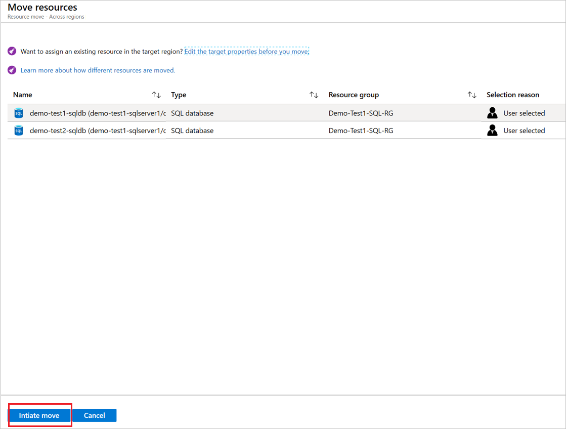Azure 资源移动器当前不会跨区域移动 SQL Server。 必须先在目标区域中分配目标 SQL Server,然后提交移动。