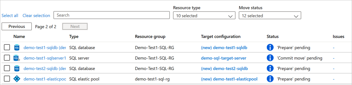 在“跨区域”中,选择 SQL 资源,然后选择“提交移动”。