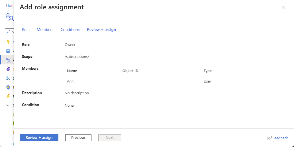 一些用户需要的访问权限可能比工作职能角色能提供的要多。 如果必须分配所有者角色,请考虑添加条件或使用 Microsoft Entra Privileged Identity Management (PIM) 来约束角色分配。