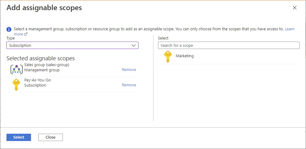 在可分配范围中,只能定义一个管理组。 不支持将可分配范围设置为根范围(“/”)。
