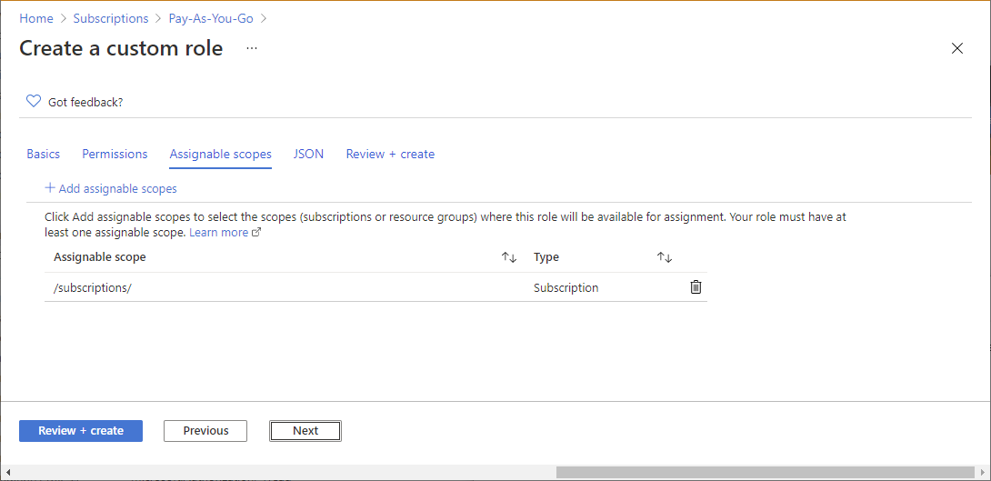 在“可分配范围”选项卡上,指定自定义角色可用于分配的地方,例如管理组、订阅或资源组。 根据所选的开始创建角色的方式,此选项卡可能已经列出你打开“访问控制(IAM)”页时所处的范围。