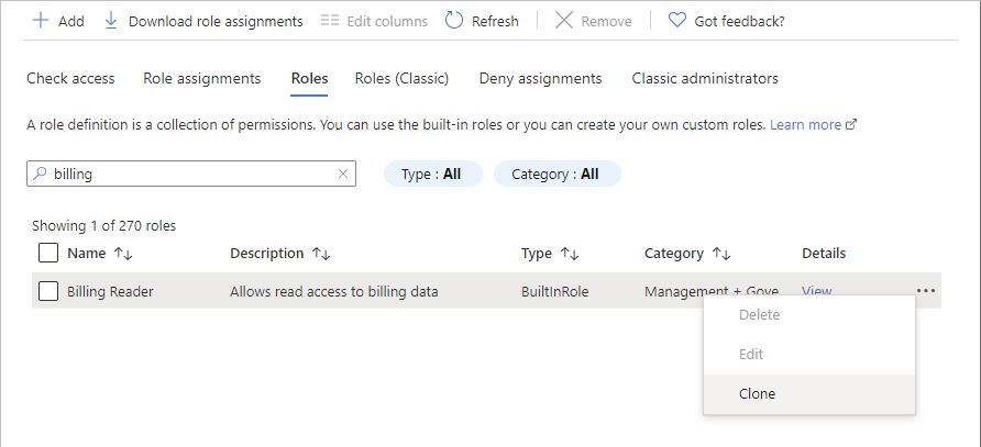搜索要克隆的内置角色或自定义角色,例如计费读取者角色。