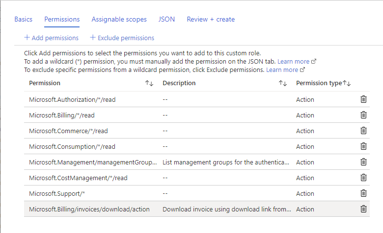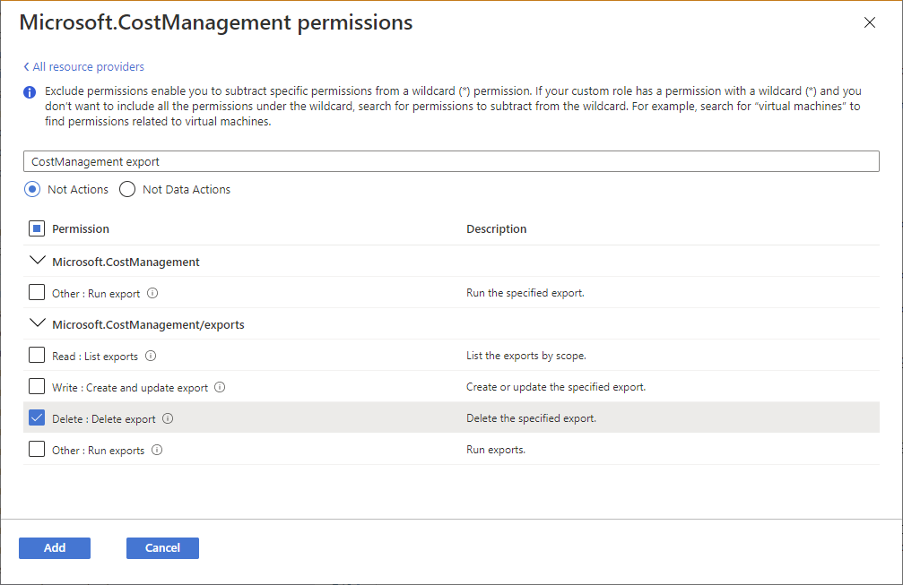 根据所选的开始创建角色的方式,权限列表中可能存在包含通配符 (*) 的权限。 通配符 (*) 将权限扩展到与所提供的操作字符串匹配的所有内容。 例如,以下通配符字符串添加了与 Azure 成本管理和导出相关的所有权限。 此通配符权限还包括将来可能要添加的任何导出权限。