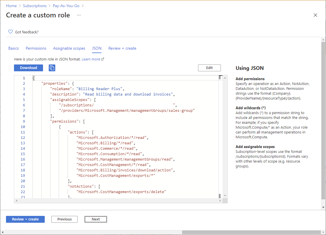 在“JSON”选项卡上,可以看到 JSON 格式的自定义角色。 如果需要,可以直接编辑 JSON。