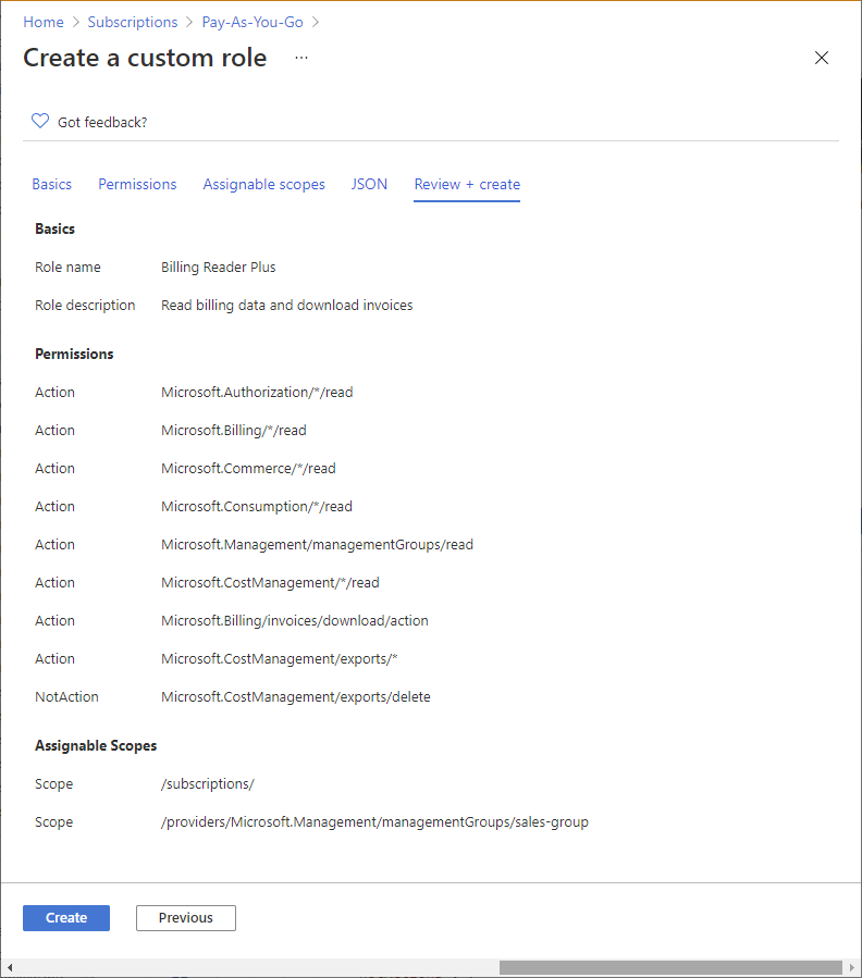 在“查看 + 创建”选项卡上,可以查看自定义角色设置。