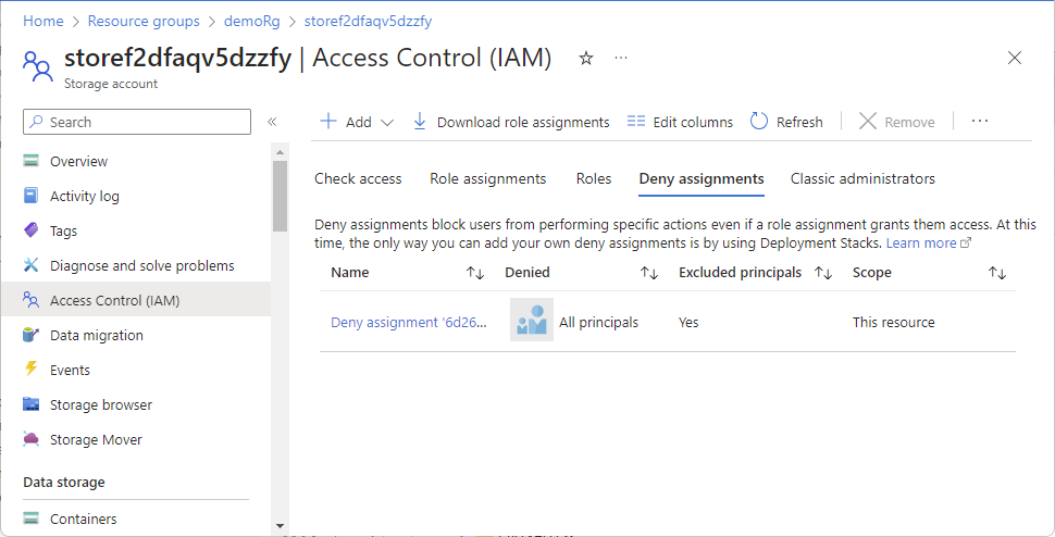 Id : /subscriptions/11111111-1111-1111-1111-111111111111/resourceGroups/demoRg/providers/Microsoft.Storage/storageAccounts/storef2dfaqv5dzzfy/providers/Microsoft.Authorization/denyAssignments/6d266d71-a890-53b7-b0d8-2af6769ac019