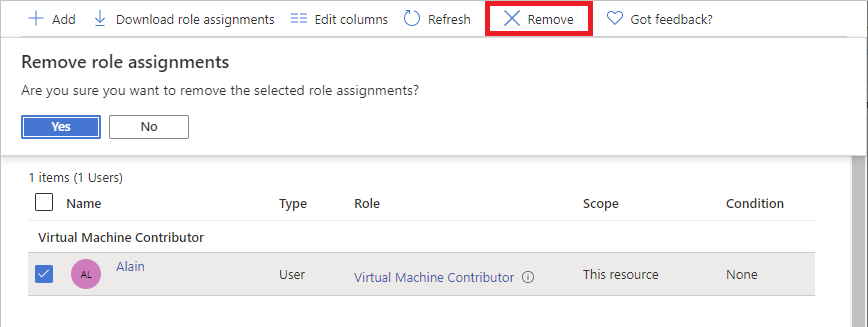 在 Azure RBAC 中,若要删除访问权限,请删除角色分配。