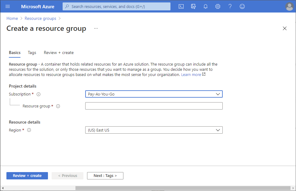 选择 “查看 + 创建 ”,然后选择“ 创建 ”以创建资源组。