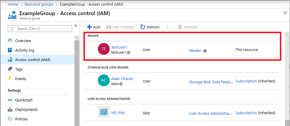 下面显示了在部署模板后向资源组的用户分配“读者”角色的示例。