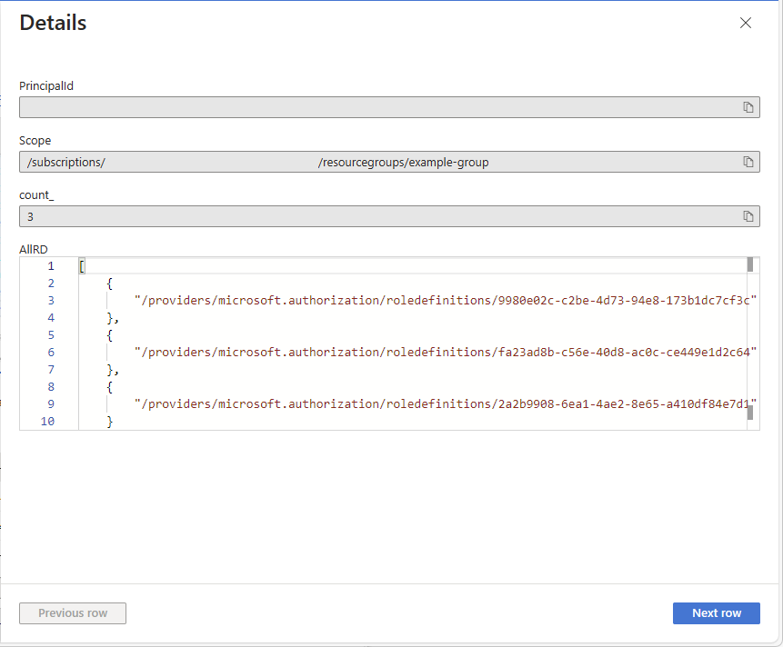 列 说明 PrincipalId 分配了内置角色的主体的 ID。 Scope 内置角色分配的范围。 count_ 具有相同主体和相同范围的内置角色分配数。 AllRD 内置角色的 ID 和名称。 在一行中,选择“查看详细信息”以打开“详细信息”窗格。