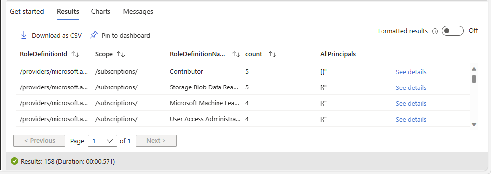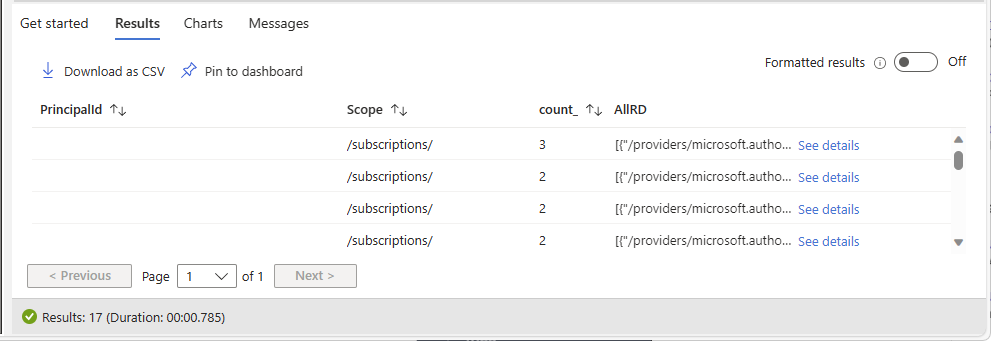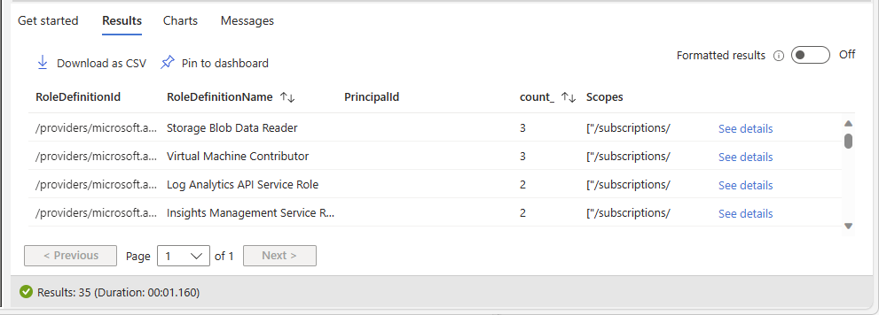 authorizationresources | where type =~ "microsoft.authorization/roleassignments" | where id startswith "/subscriptions" | extend RoleDefinitionId = tolower(tostring(properties.roleDefinitionId)) | extend PrincipalId = tolower(properties.principalId) | extend RoleDefinitionId_PrincipalId = strcat(RoleDefinitionId, "_", PrincipalId) | join kind = leftouter ( authorizationresources | where type =~ "microsoft.authorization/roledefinitions" | extend RoleDefinitionName = tostring(properties.roleName) | extend rdId = tolower(id) | project RoleDefinitionName, rdId ) on $left.RoleDefinitionId == $right.rdId | summarize count_ = count(), Scopes = make_set(tolower(properties.scope)) by RoleDefinitionId_PrincipalId,RoleDefinitionName | project RoleDefinitionId = split(RoleDefinitionId_PrincipalId, "_", 0)[0], RoleDefinitionName, PrincipalId = split(RoleDefinitionId_PrincipalId, "_", 1)[0], count_, Scopes | where count_ > 1 | order by count_ desc下面显示了结果示例。 count_ 列是具有相同角色和相同主体的不同范围的角色分配数。 计数按降序排序。