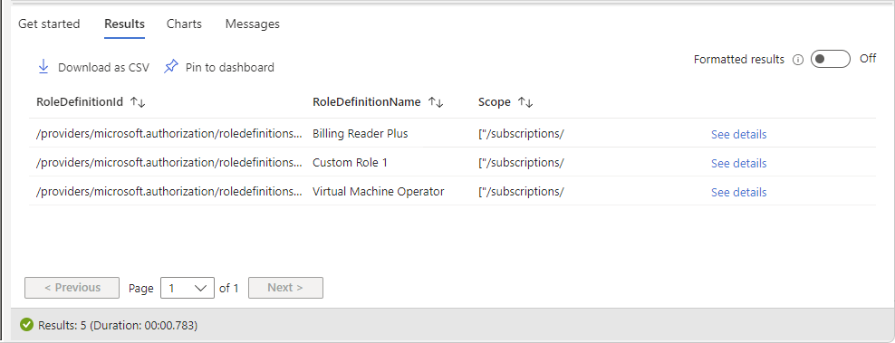 authorizationresources | where type =~ "microsoft.authorization/roledefinitions" | where tolower(properties.type) == "customrole" | extend rdId = tolower(id) | extend Scope = tolower(properties.assignableScopes) | join kind = leftouter ( authorizationresources | where type =~ "microsoft.authorization/roleassignments" | extend RoleId = tolower(tostring(properties.roleDefinitionId)) | summarize RoleAssignmentCount = count() by RoleId ) on $left.rdId == $right.RoleId | where isempty(RoleAssignmentCount) | project RoleDefinitionId = rdId, RoleDefinitionName = tostring(properties.roleName), Scope下面显示了结果示例:
