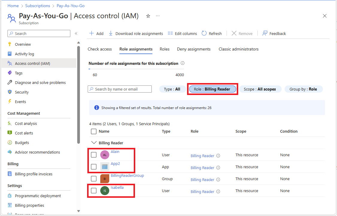 将角色分配给在同一范围内创建的组。 有关详细信息,请参阅使用 Azure 门户分配 Azure 角色。