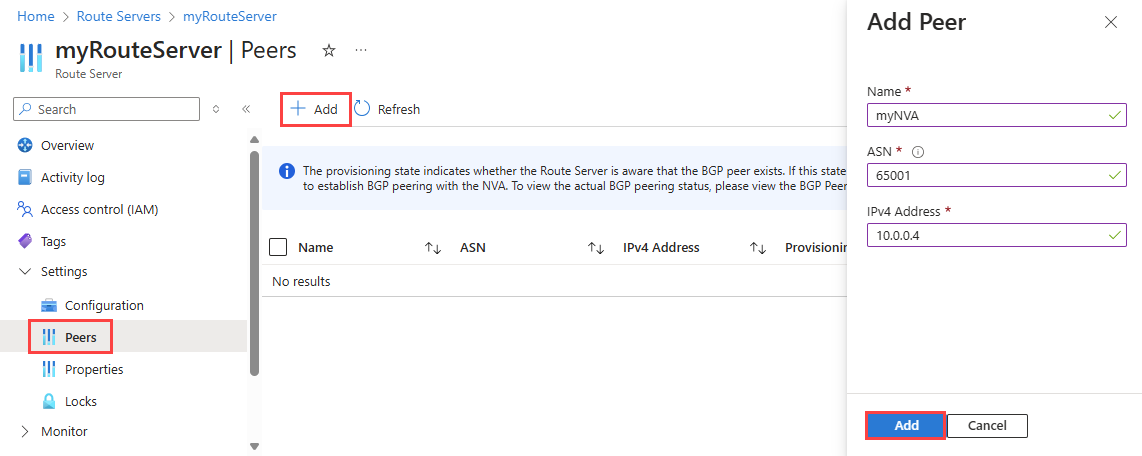 设置 值 名称 用于标识 BGP 对等方的名称。 这不需要与实际的 NVA 名称匹配。 ASN NVA 的自治系统编号 (ASN)。 有关详细信息,请参阅可以使用哪些自治系统编号 (ASN)? IPv4 地址 myRouteServer 将与之通信的 NVA 的专用 IP 地址,该地址用于建立 BGP。 选择 “添加” 以创建 BGP 对等连接。