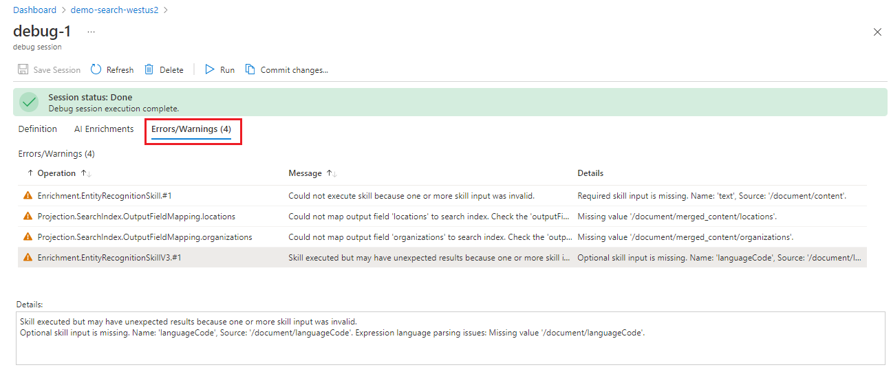 Azure portal中的索引器执行历史记录提供所有文档的完整错误和警告列表。 在调试会话中,错误和警告仅限于一个文档。 你可以浏览此列表,做出更改,然后返回该列表以确认问题是否已解决。