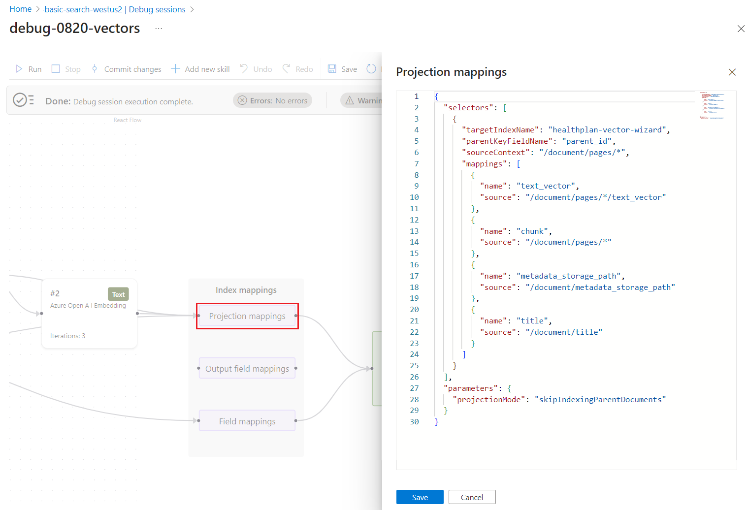 调试会话是缓存的索引器和技能组执行(范围为单个文档),可使用它通过交互方式编辑和测试技能组更改。 调试完成后,可以将更改保存到技能组中。