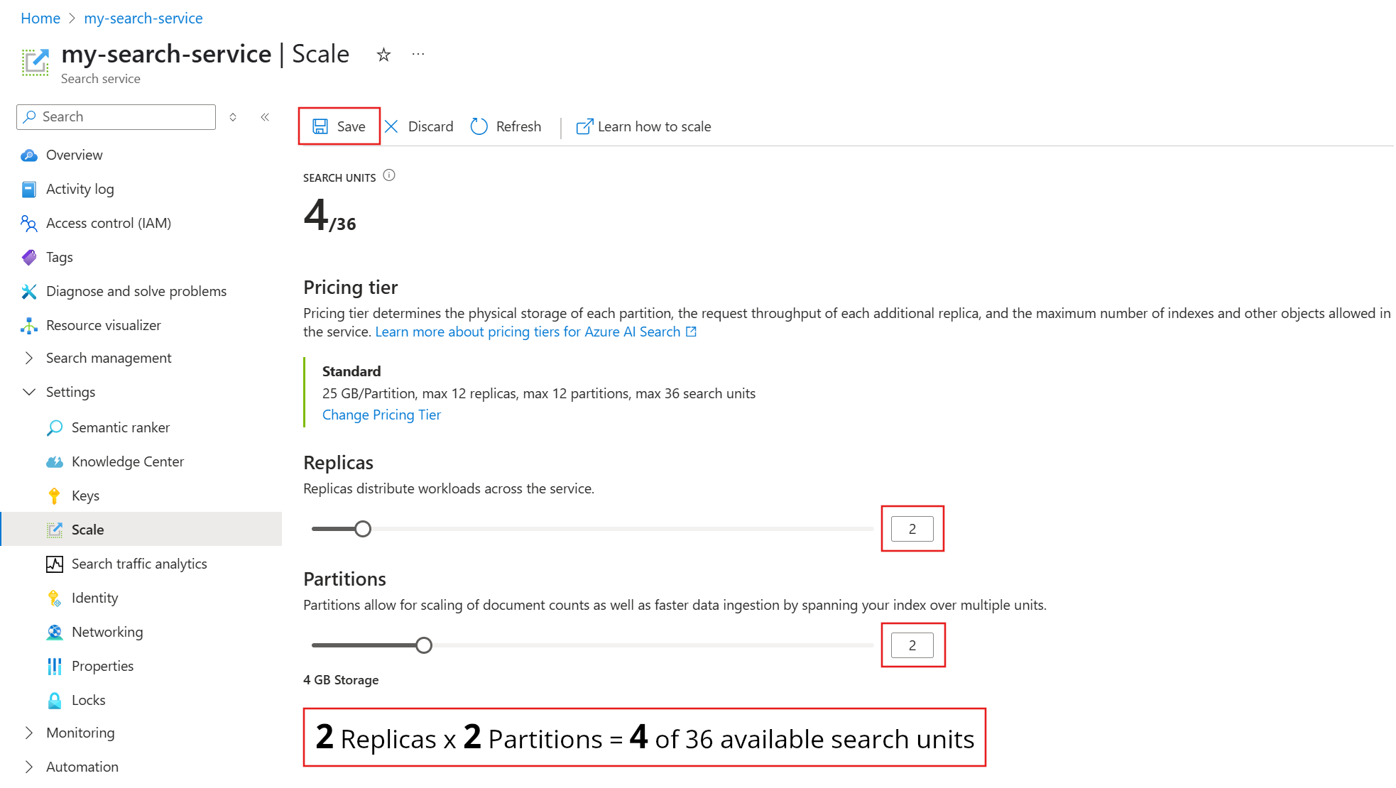 此示例添加第二个副本和分区。 请注意搜索单位计数;现在有 4 个搜索单位,因为计费公式是副本数乘以分区数 (2 x 2)。 翻倍增加容量会导致运行服务的成本超过翻倍。 如果搜索单位的成本是 $100,则新的每月费用将是 $400。