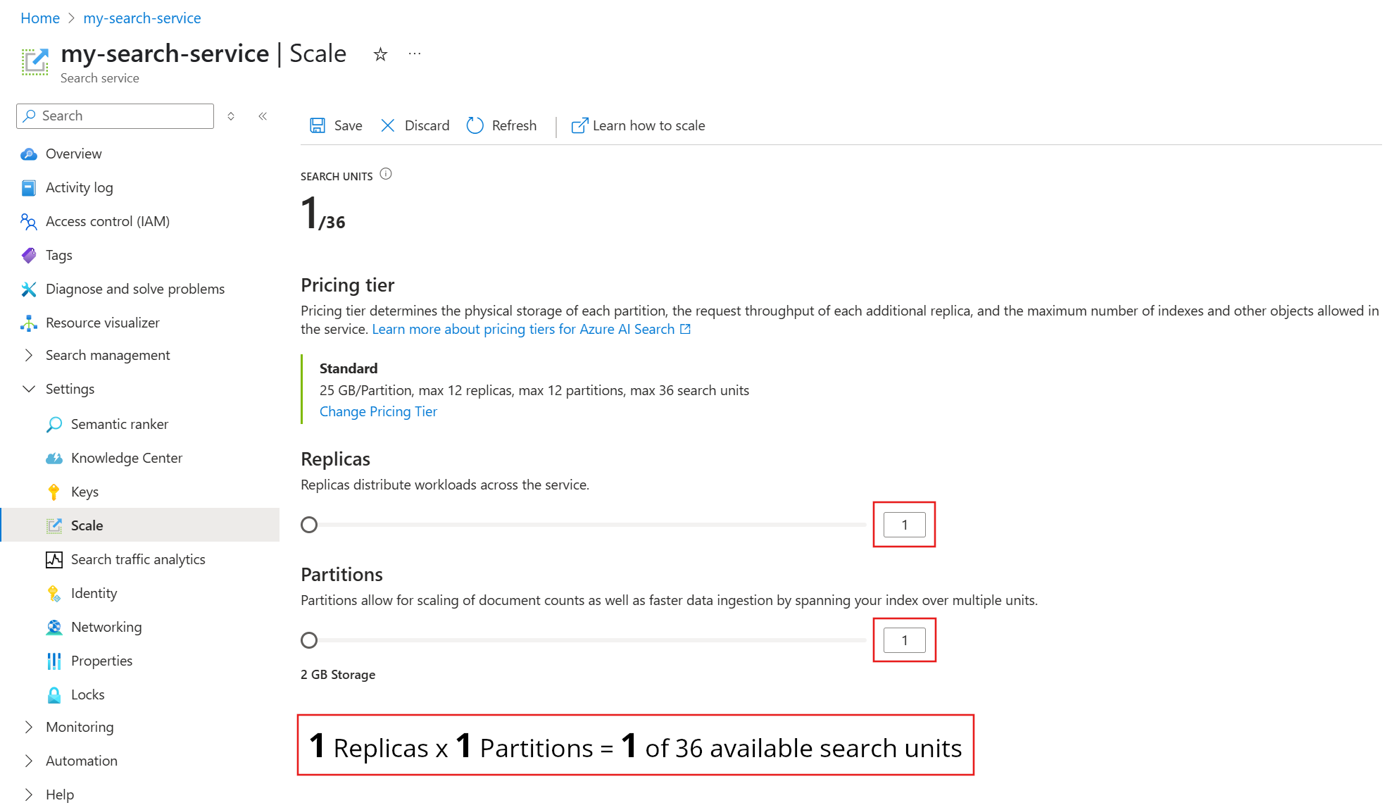 | 搜索单位 | 可用容量总量的单个增量。 运行服务至少需要一个搜索单元。 根据定价层,最大范围为 1 到 36 个单位。 搜索单位数等于副本数乘以分区数:R × P = SU。 每个服务都从一个副本和一个分区开始,这种组合消耗一个单位:1 × 1 = 1。 添加第二个副本消耗两个单位:2 个× 1 = 2。 搜索单位也是搜索服务的计费单位。 |