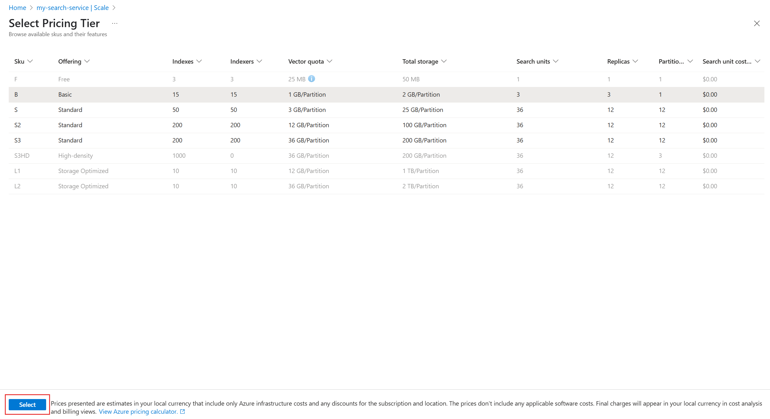 定价层确定搜索服务的最大存储。 如果需要更多或更少的容量,可以切换到满足存储需求的其他定价层。