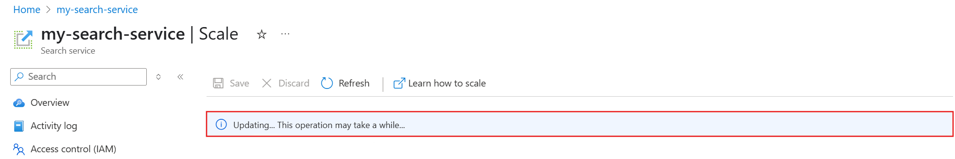 | “目前不允许服务更新操作,因为我们正在处理以前的请求。” | 另一缩放操作正在进行中。 | 查看 Azure 门户中的“概述”页,或使用搜索管理 REST API、Azure PowerShell 或 Azure CLI 获取搜索服务的状态。 如果状态为“正在预配”,请等待它变为“成功”或“失败”,然后重试。 1, 2 |