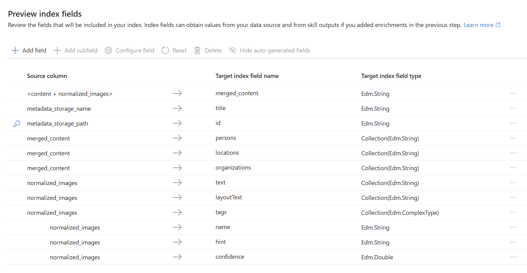 metadata_storage_path,因为该字段包含唯一值,因此被选中。默认字段属性基于所选技能。 例如,实体识别技能(