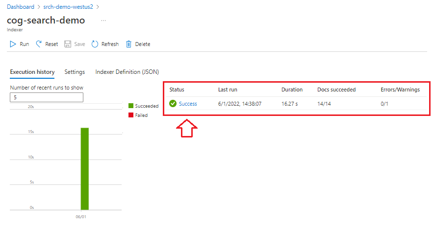可以在Azure portal中监视索引器的创建。 基于技能编制索引耗时长于基于文本编制索引,尤其是 OCR 和图像分析。