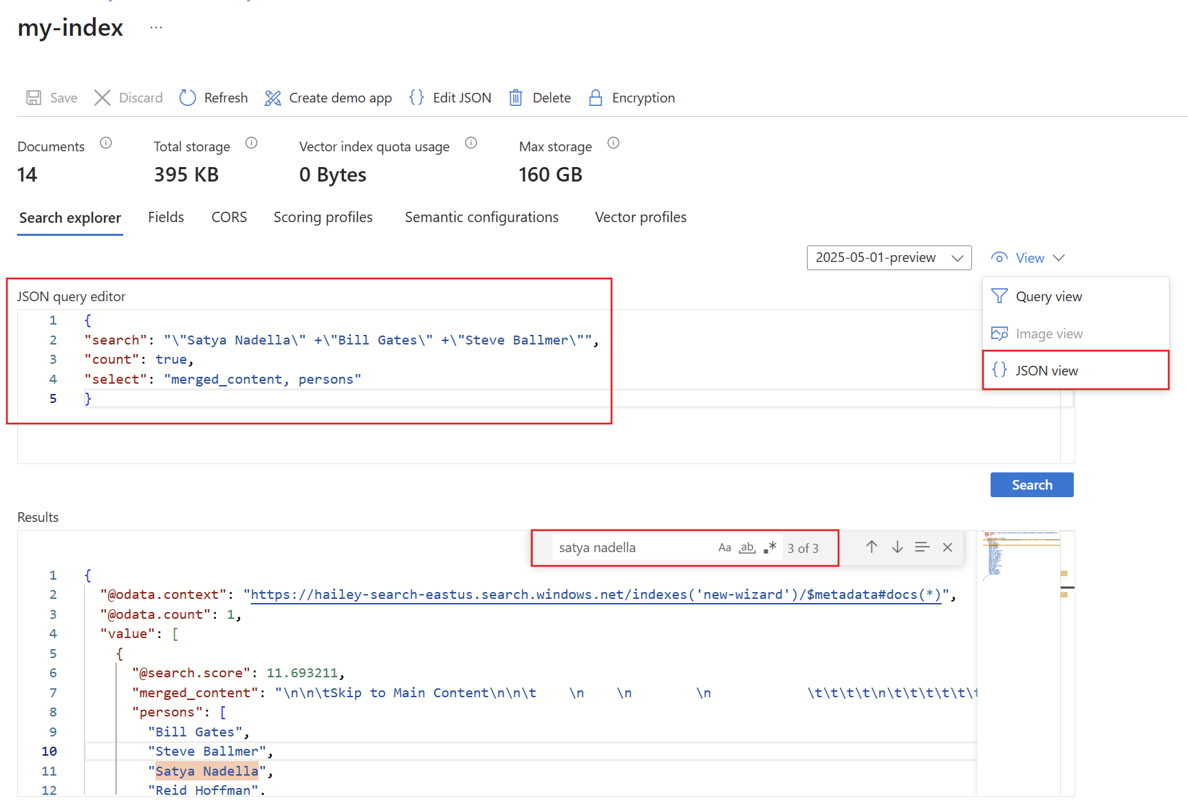 随后会返回详细的 JSON 格式的结果,这些结果可能难以阅读,尤其是在大型文档中。 下面是在此工具中搜索的提示: