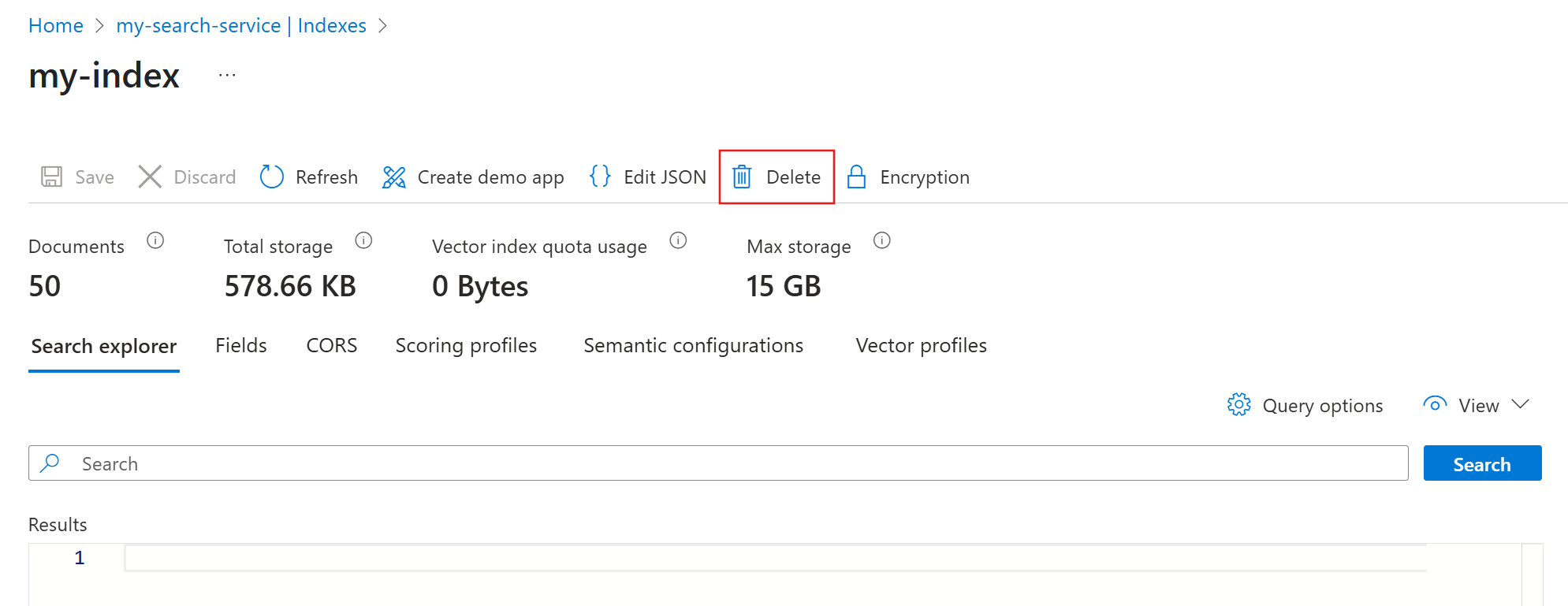 创建索引后,可以使用 Azure 门户访问其统计信息和定义,或将其从搜索服务中删除。
