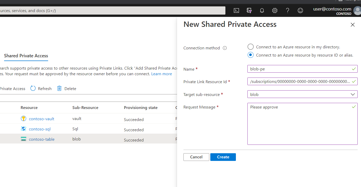 如果资源的预配状态 (properties.provisioningState) 为“Succeeded”且连接状态 (properties.status) 为“Approved”,则表示共享专用链接资源正常运行,可以将索引器配置为通过专用终结点通信。