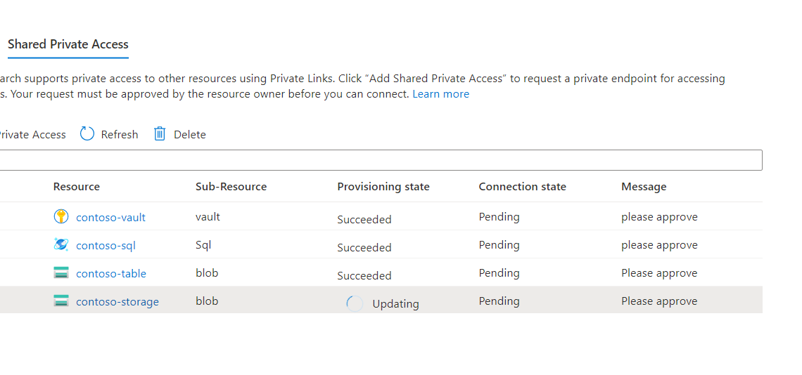 完成此部分的步骤后,您将获得一个已配置但处于挂起状态的共享专用链接。 创建该链接需要几分钟时间。 创建后,资源所有者必须先批准请求,然后才能进行操作。