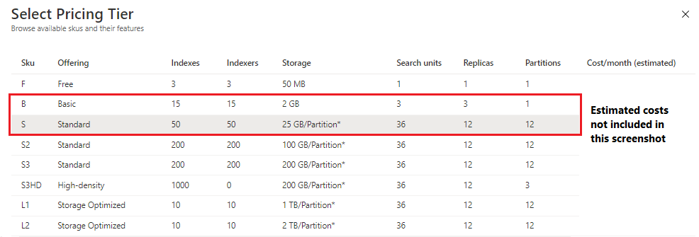 预配服务时,可以在定价页上、Azure AI 搜索中的服务限制一文中以及 Azure 门户页上找到有关各个层的详细信息。