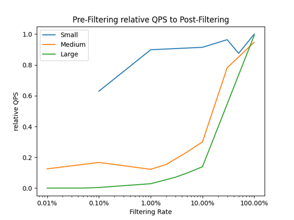 垂直轴表示预筛选相对于后筛选的相对性能,表示为 QPS 的比率(每秒查询数)。 例如: