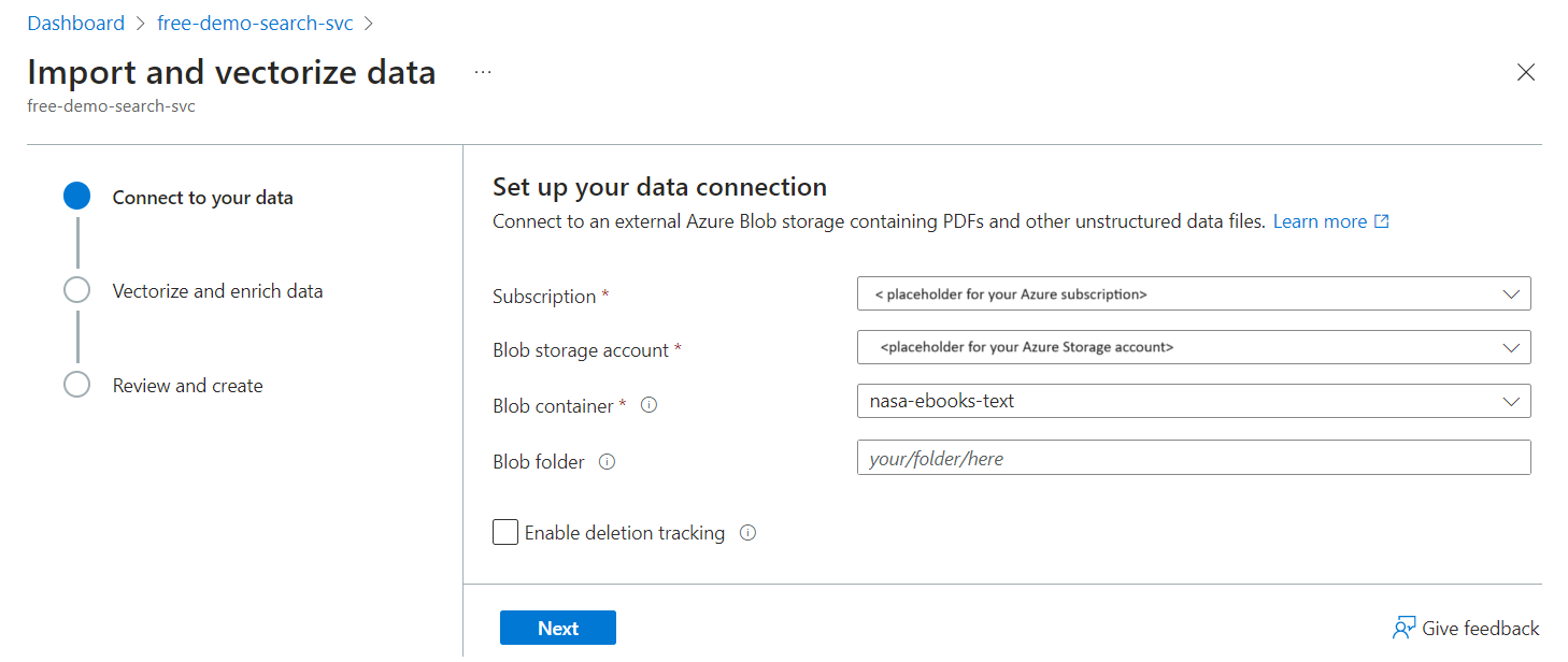 Azure portal中的 Import 数据(new)向导可以从Azure Blob Storage读取文件,创建包含分块字段和矢量化字段的索引,并添加向量器。 根据设计,向导生成的矢量化器被设置为用于为 Blob 内容编制索引的同一嵌入模型。