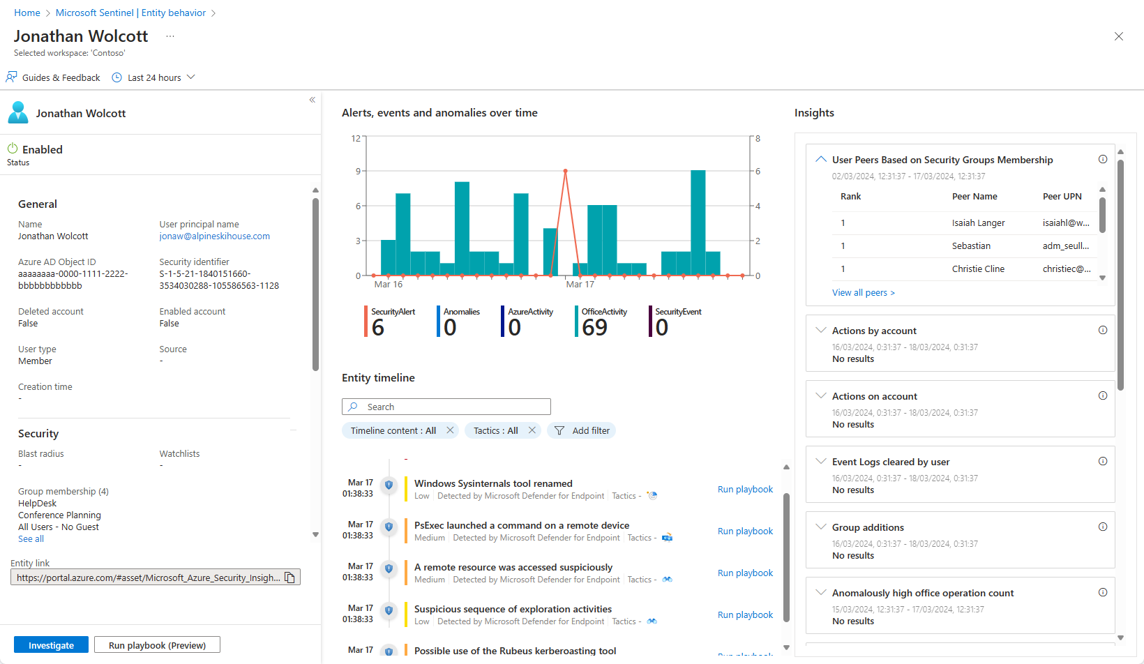 中间面板显示与实体相关的重要事件(例如警报、书签和活动)的图形和文本时间线。 活动是 Log Analytics 中的重要事件的聚合。 检测这些活动的查询是由 Microsoft 安全研究团队开发的。