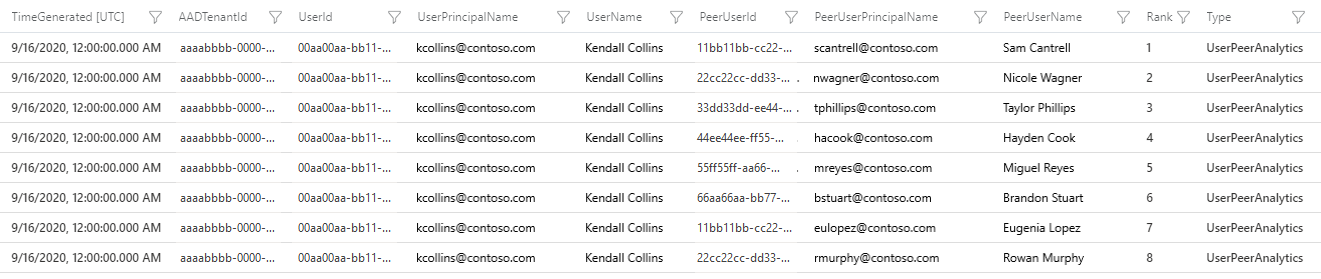 此屏幕截图展示了 UserPeerAnalytics 表中的数据示例,其中包含用户 Kendall Collins 排名最高的八位同行。 Sentinel 使用 TF-IDF 算法在计算对等排名时规范化权重。 较小的组具有更高的权重。
