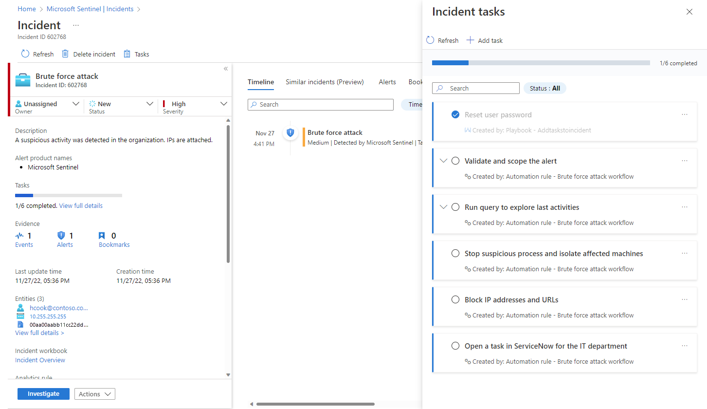 使用 playbook 中的“添加任务”操作(在 Microsoft Sentinel 连接器中)将任务自动添加到触发 playbook 的事件。