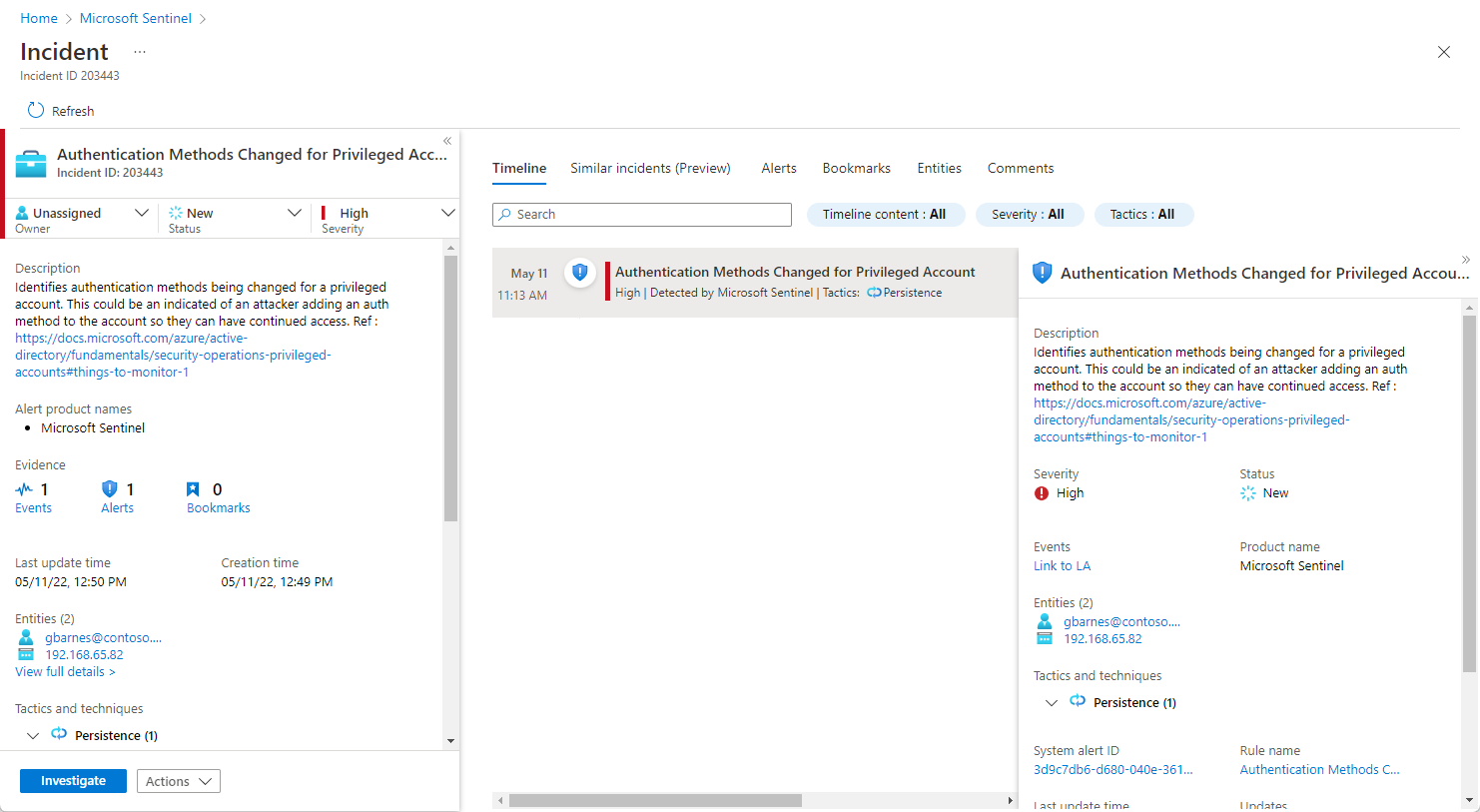 一个事件可以包含多个警报。 它是用于特定调查的所有相关证据的聚合。 事件根据“分析”页中创建的分析规则而创建。 在事件级别设置与警报相关的属性,例如严重性和状态。 为 Microsoft Sentinel 指定要查找的威胁类型以及查找方式后,可以通过调查事件来监视检测到的威胁。